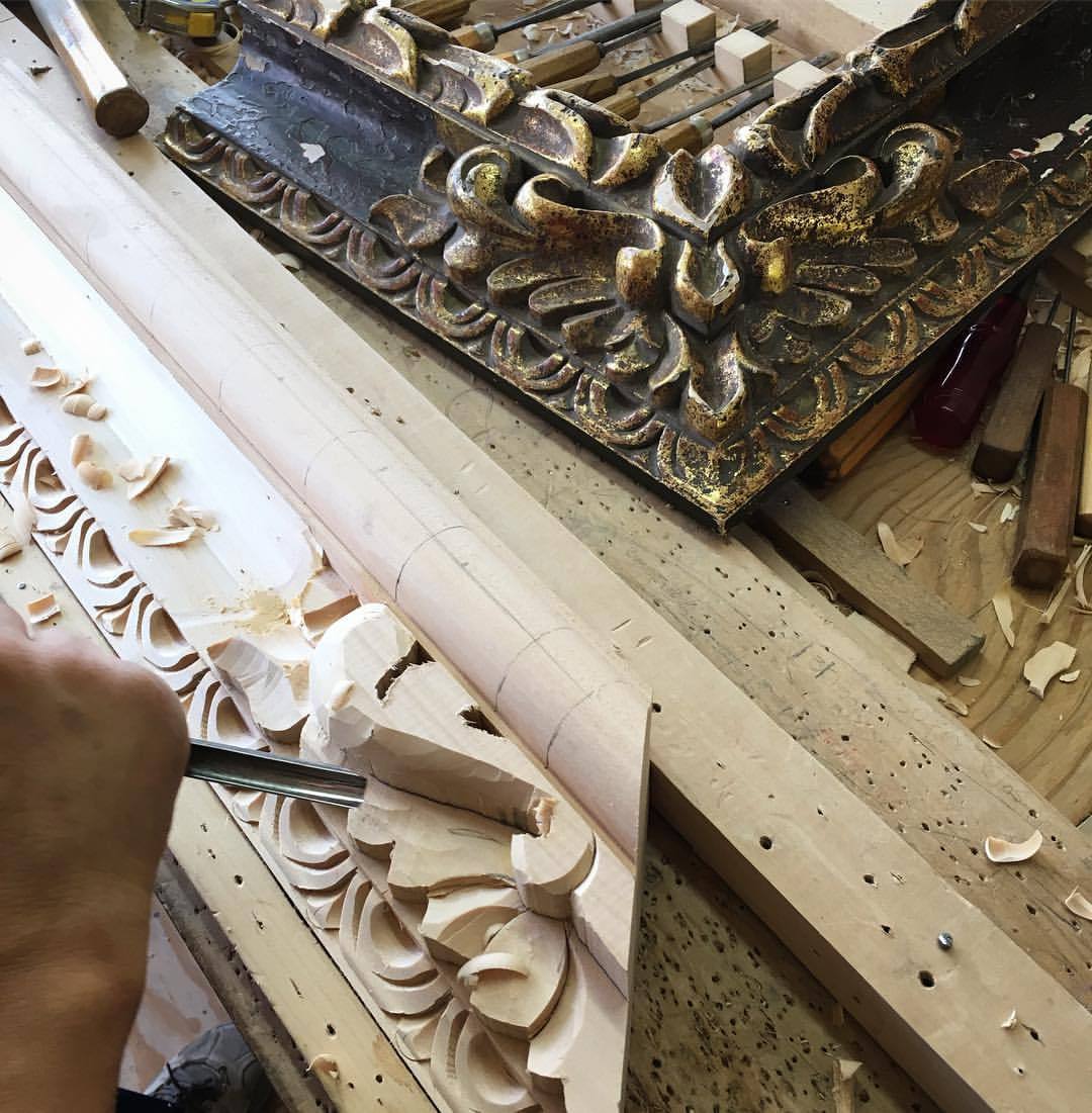 Carving our 5 inch wide Spanish frame number C520. #handcarved #woodcarving #gold #goldleaf #framing #customframing #cjframes #frame #art #museum #design #interiors #madeinusa #pictureframes #museumframing #woodworking #decor #interiordesign #artisan #crafts #picoftheday #instaart #instadesign #instadecor #picoftheday #handmade (at C&J Picture Frames Inc.)