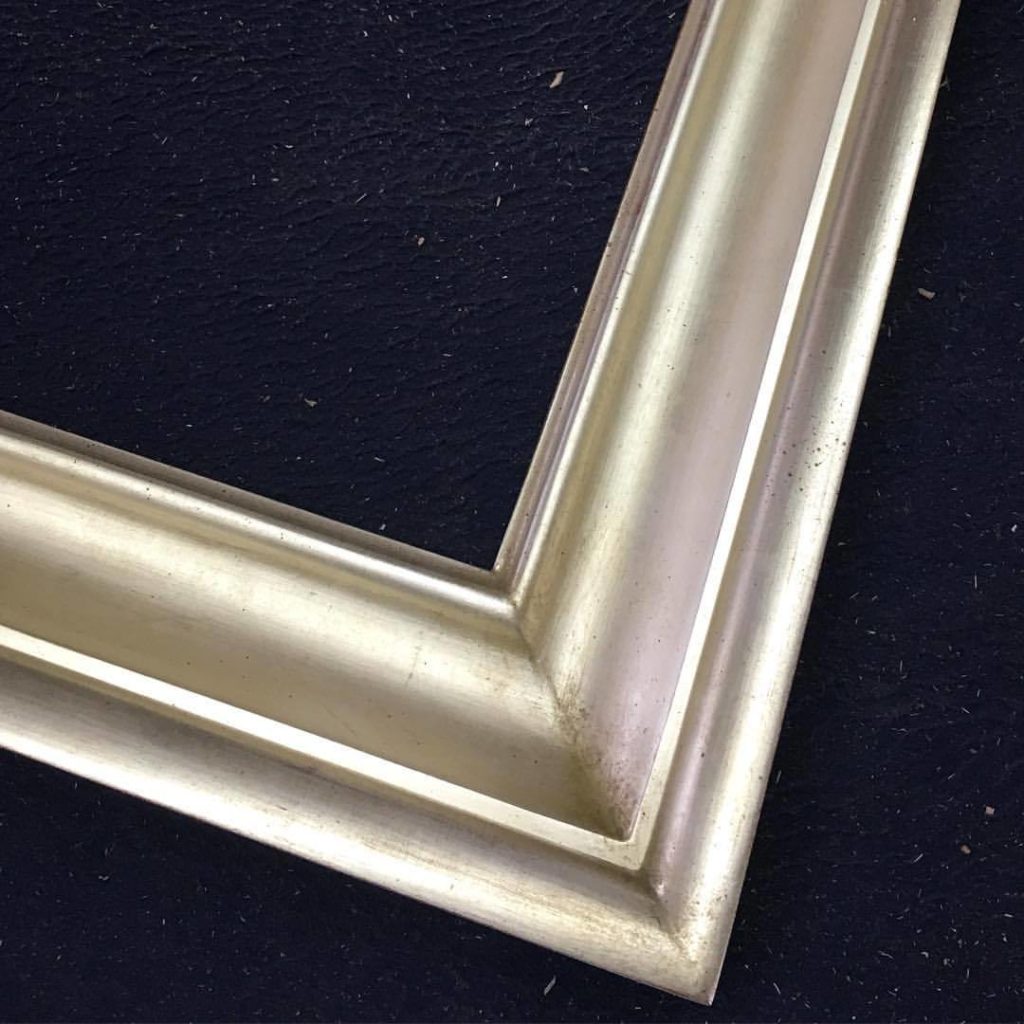 3 ¼" wide scoop frame. Finished in 12k white gold with a double gilded matte panel. C&J frame umber A008. .